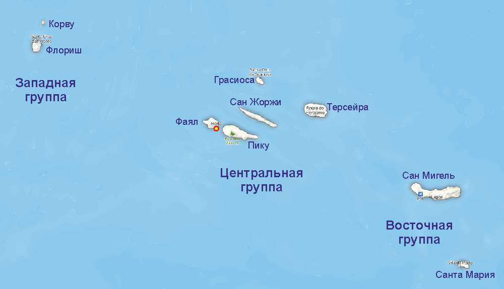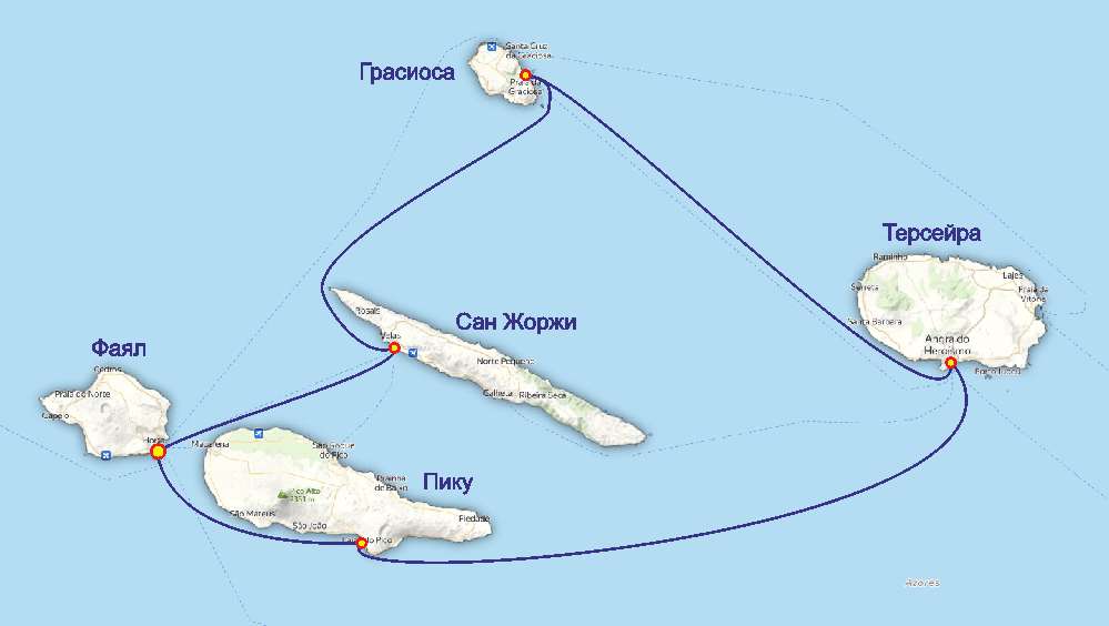 Недельный маршрут по Центральной группе островов выглядит примерно так: Фаял — Сан Жоржи — Грасиоса — Терсейра — Пику — Фаял. Протяженность маршрута 180 миль. Переход Фаял — Сан Жоржи чуть более 20 миль, что позволяет стартовать в первый день сразу после приемки лодки. Переход Пику — Фаял также около 20 миль, что позволяет спокойно проснуться, позавтракать и не торопясь пойти в базовую марину. Остальные переходы от 6 до 10 часов и могут занять целый день или ночь в зависимости от предпочтений экипажа.
