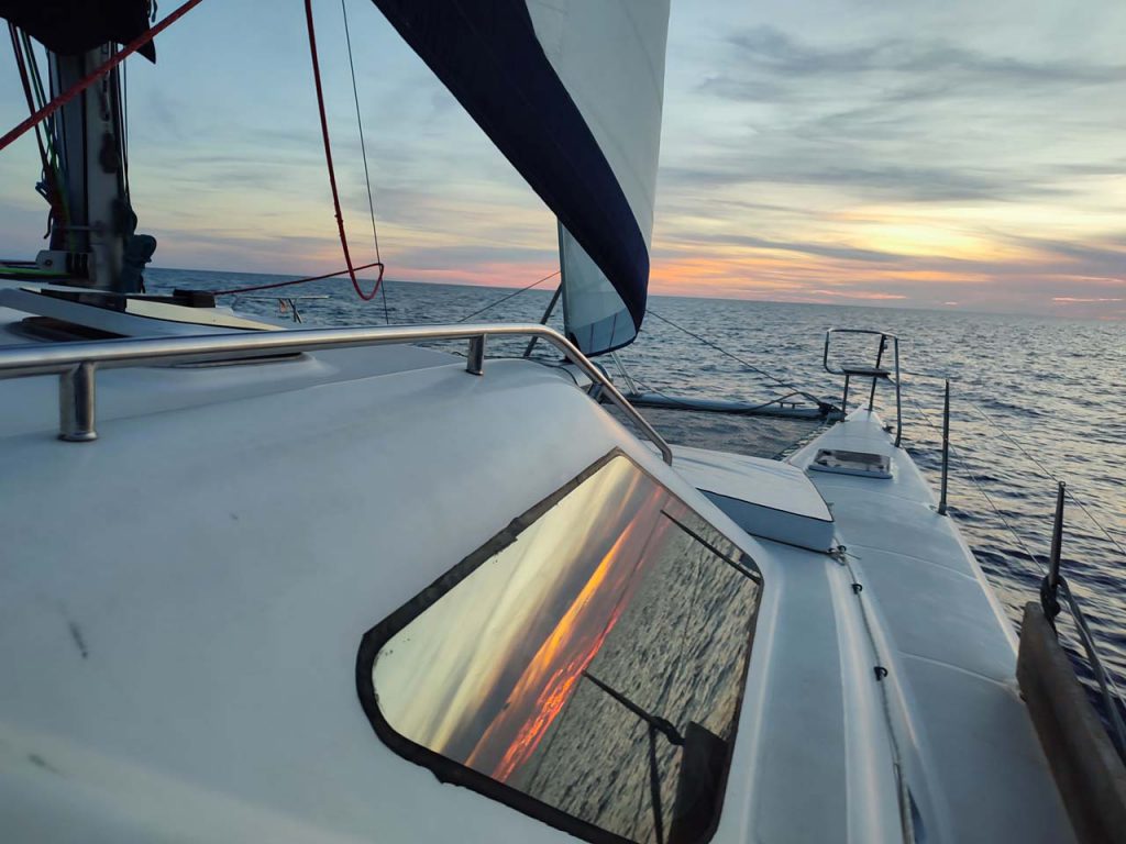 До обеда успели приобрести испанскую симку для интернета на целых 300 Гигов, куда их девать непонятно. Раньше более 40 Гб на месяц не предлагали. Основную массу провизии заказали заранее через интернет доставкой из Меркадоны. На удивление доставили всё и вовремя, практически целый маленький грузовик. После доставки точечно закупили недостающее. Провизией забиты на 2-3 недели, можно выходить! Катамаран приняли довольно быстро, удалось выйти в субботу в 18:30. На закате покидаем порт, за кормой тает Майорка.