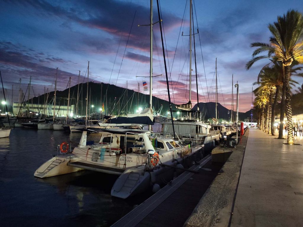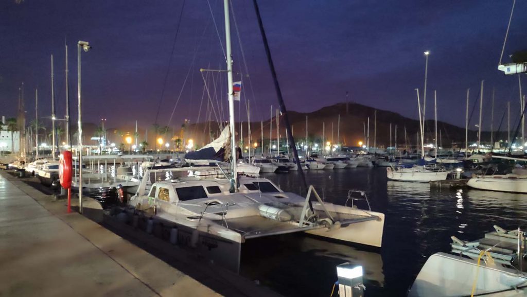 Ветер слабоват, приходится помогать дизелем. Весь воскресный день проходит при ярком солнце и слабом ветре, иногда идем чисто под парусами. Ночью без Луны темновато. Полнолуние обещают только на 5 ноября… В понедельник после обеда появляется устойчивый юго-западный ветер, по прогнозу к вечеру он существенно усилится, поэтому включаем дизеля на 1800 и стараемся побыстрее дойти до Картахены. Неподалеку от Картахены ветер уже более 20-ти узлов, волна более 2-х метров. Поворачиваем в порт, ветер становится попутным, волна, отраженная от мола грузового порта, создает толчею, сильно болтает, катамаран идет более 7-ми узлов.